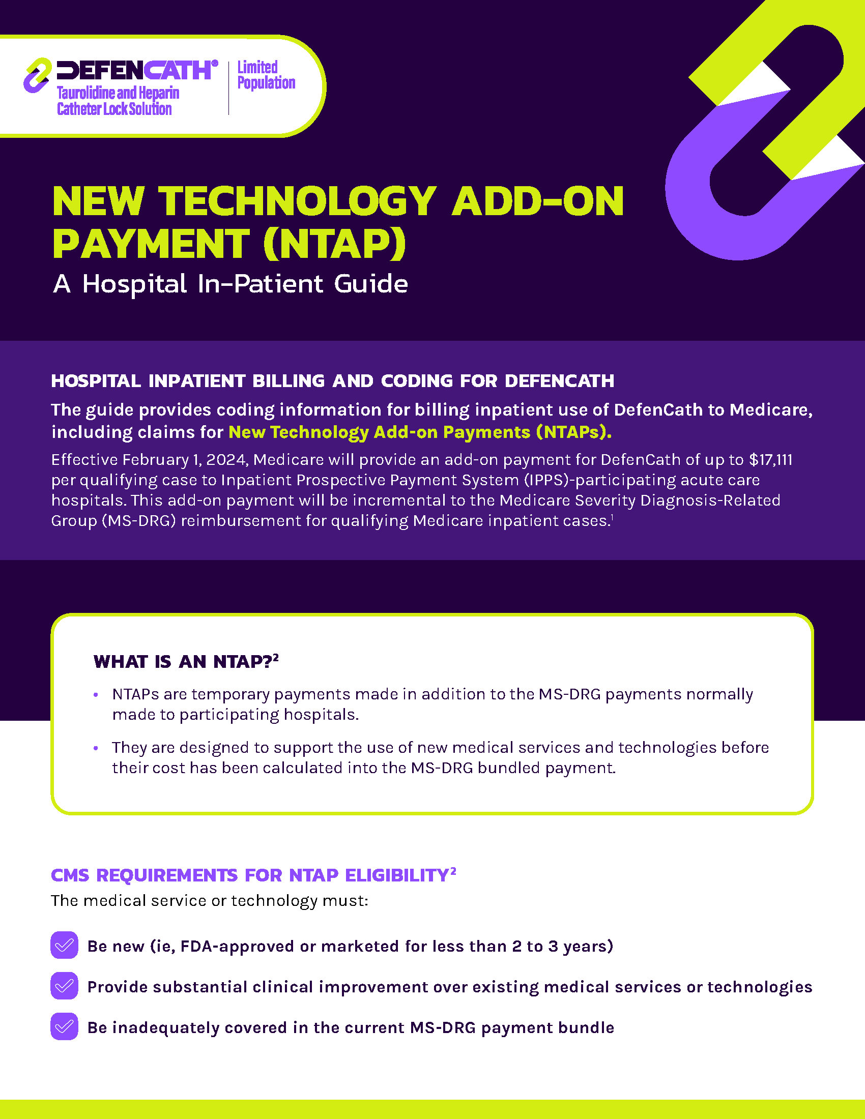 Download this resource for NTAP billing and coding information for inpatient use of DefenCath (taurolidine and heparin).